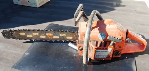 今朝使おうとしたら始動不良、ついでに刃を研いでくれと持ってきました。 99cc、本体9.3kg+バー・チェン・燃料・オイル、概算15kgほどでしょうか。80歳過ぎですが軽々と使うのでビックリです。