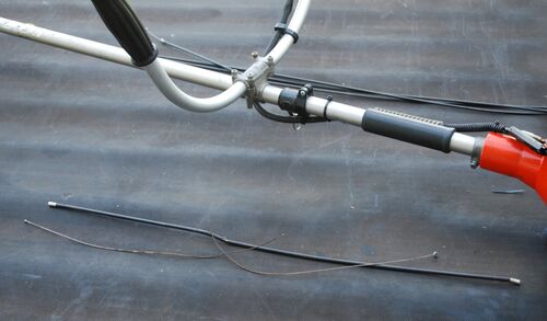 突然、アクセルが効かなくなったと持ち込んで来ました。 ワイヤーが内部で破断していました、こんな故障はお初です。 被覆の亀裂から水が浸入してワイヤーがサビ付いていました。 予備パーツと交換して終了。 数年前に譲渡した共立SRE2650G、エンジンは絶好…